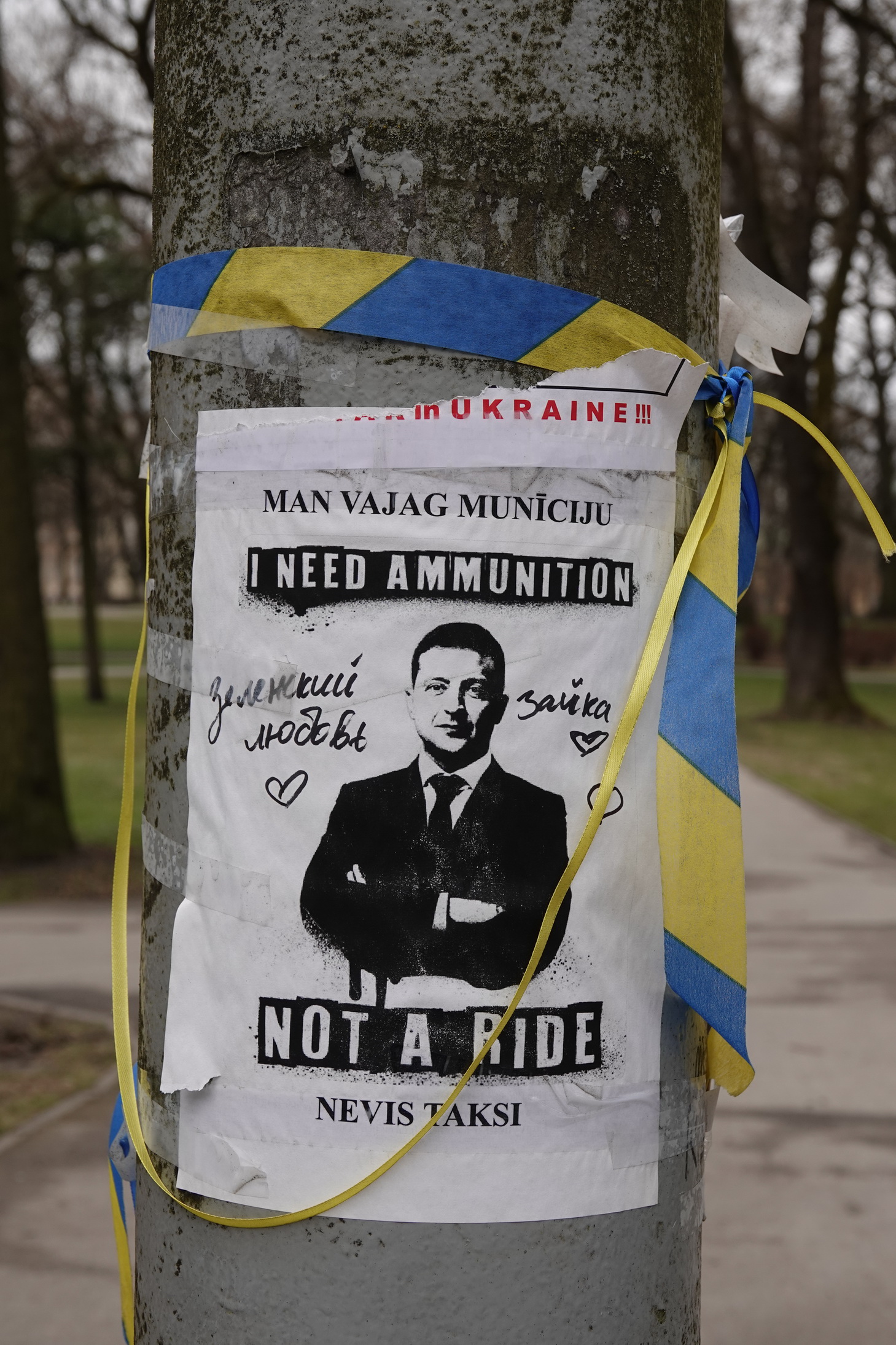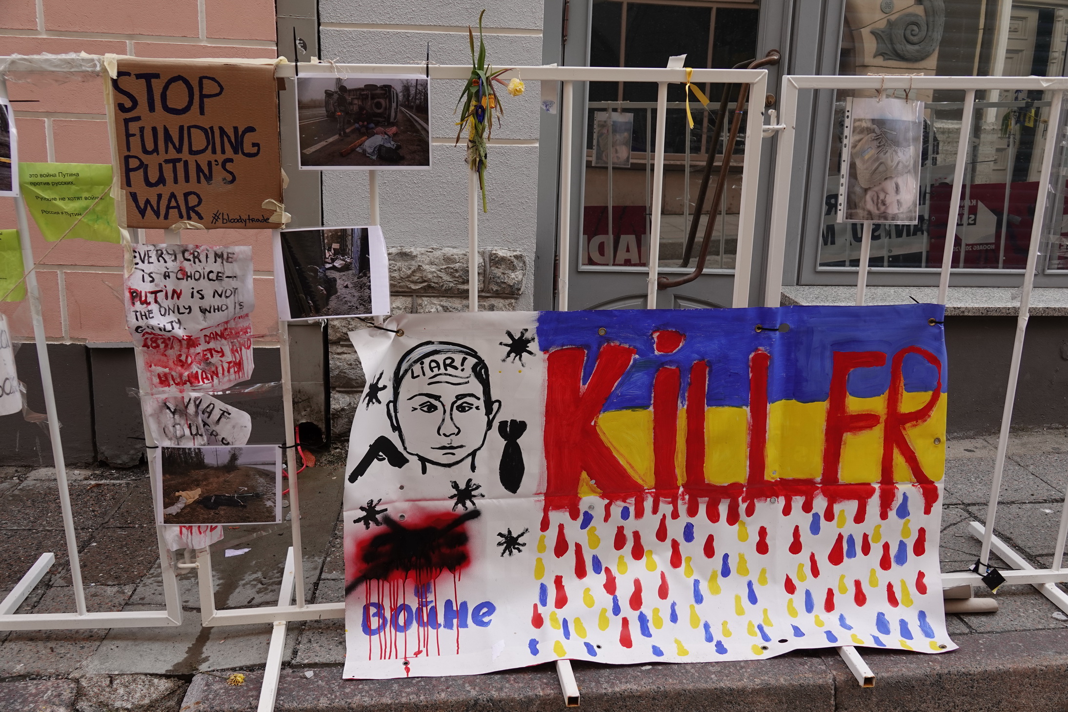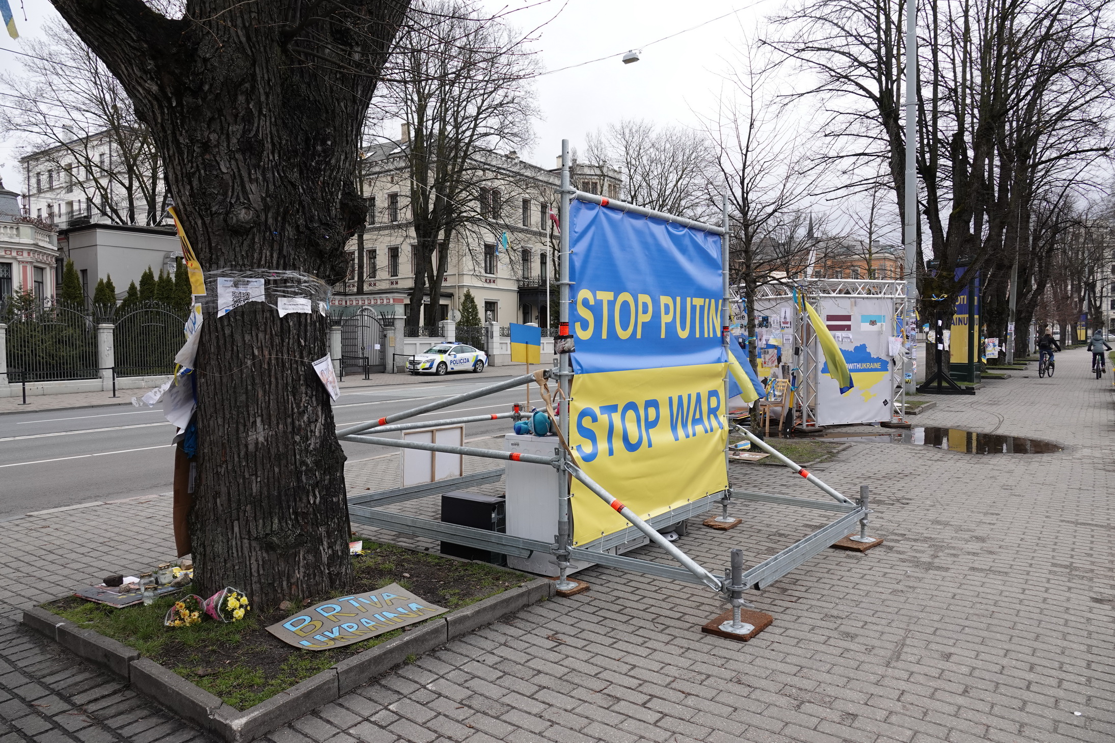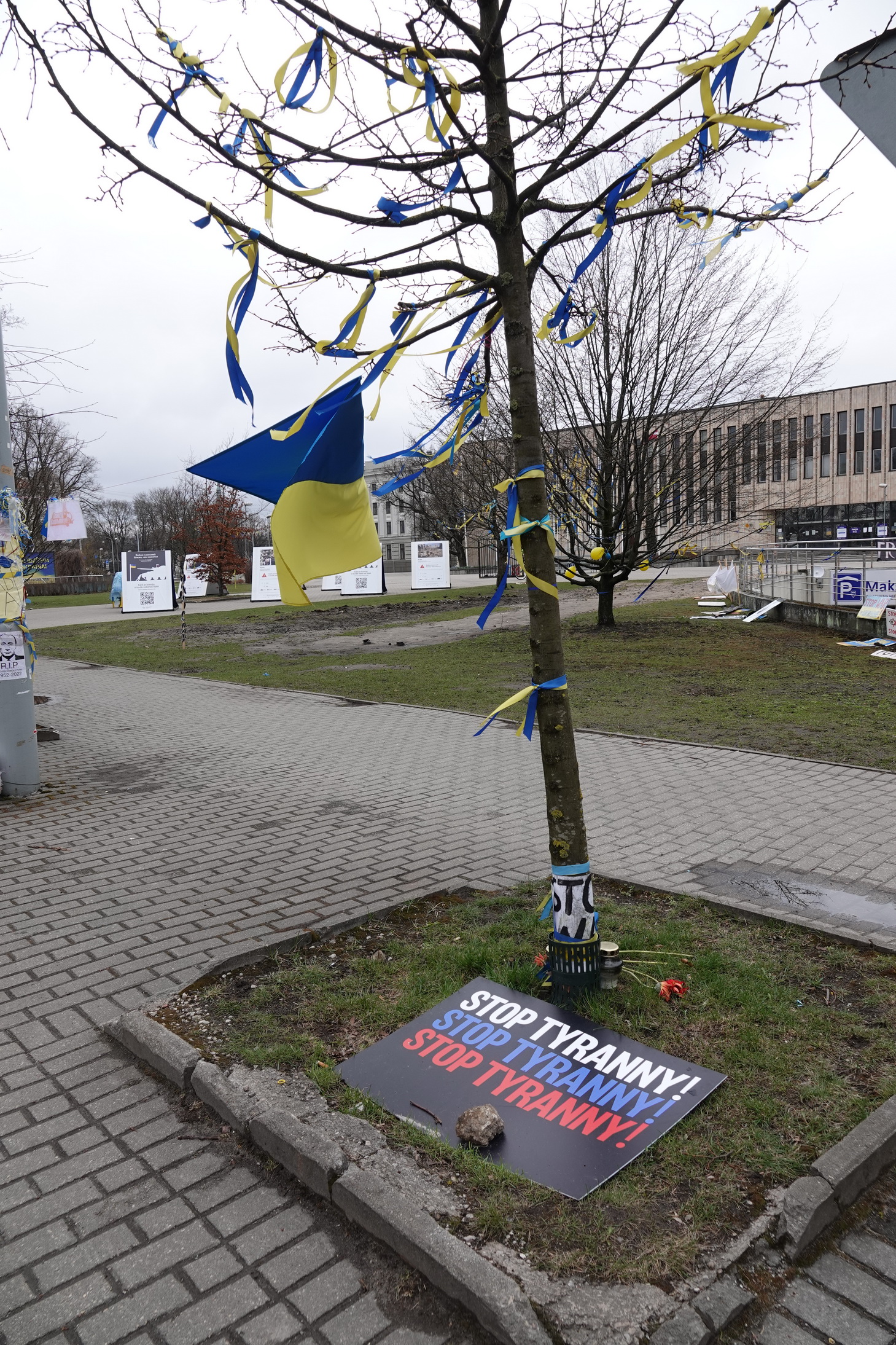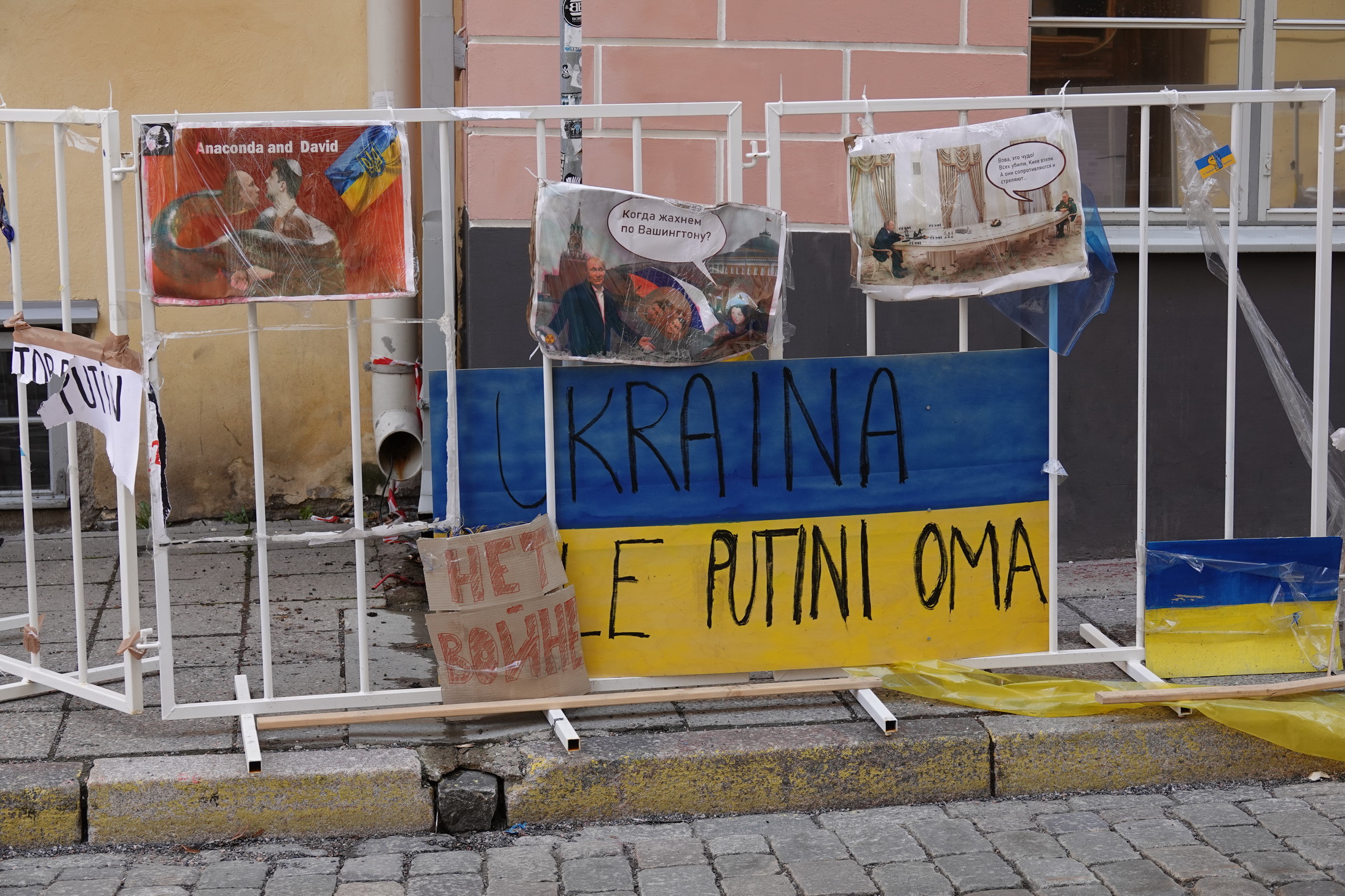 … mon voyage à Riga et à Tallinn s’est vraiment bien passé. Mais la guerre est bien là, y compris face à l’ambassade de Russie de Riga, avec cette image géante d’un Poutine semeur de mort… D’autre part, tous les transports en commun des pays baltes arborent plusieurs drapeaux ukrainiens sur chacun de leurs tramways, trolleybus et bus ! Et partout dans les villes, des panneaux géants qui proclament la solidarité des peuples baltes avec l’Ukraine.