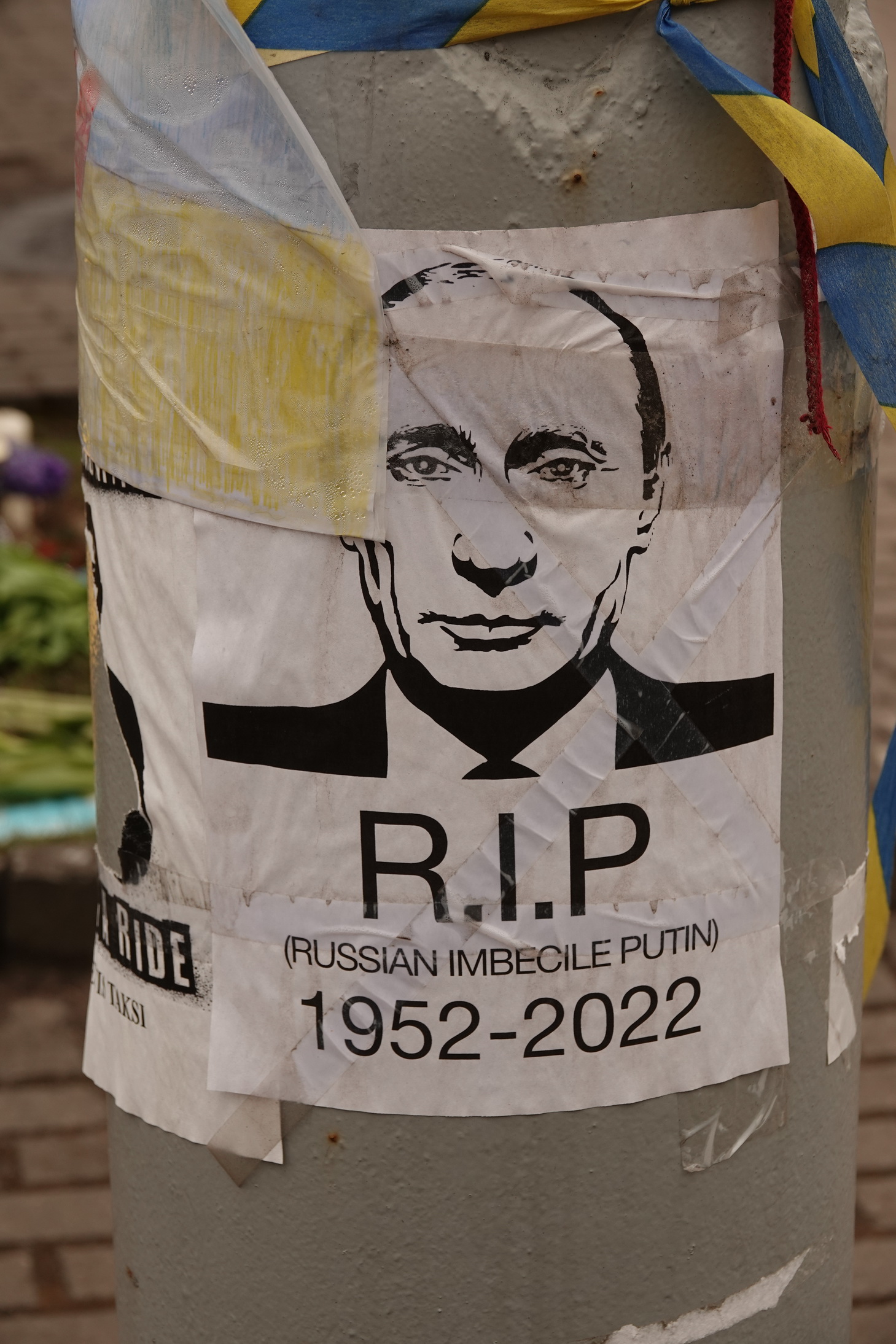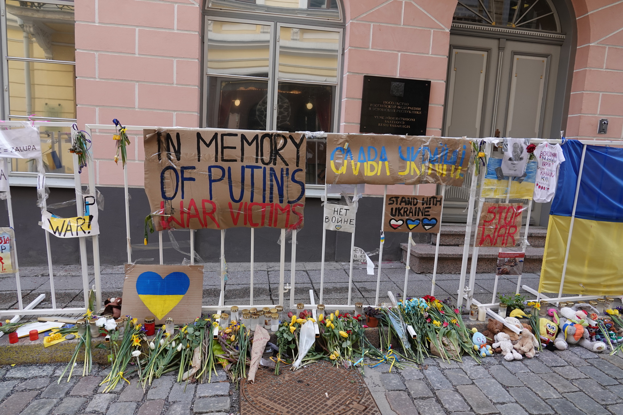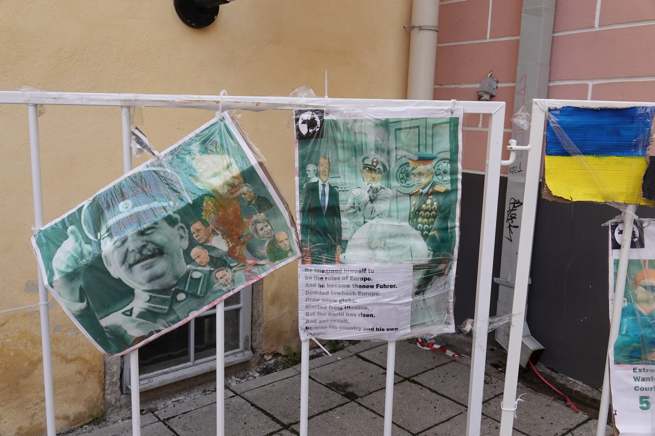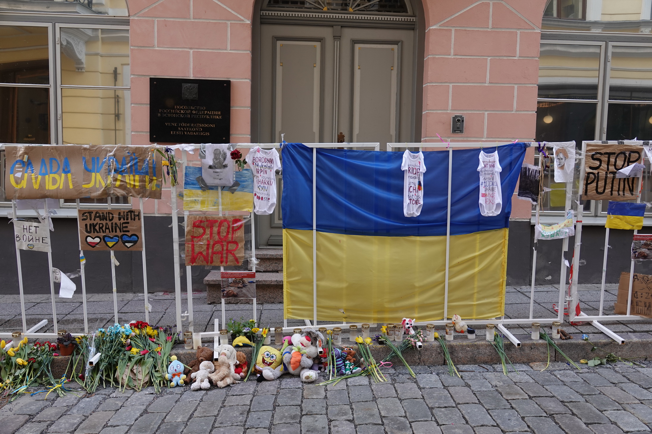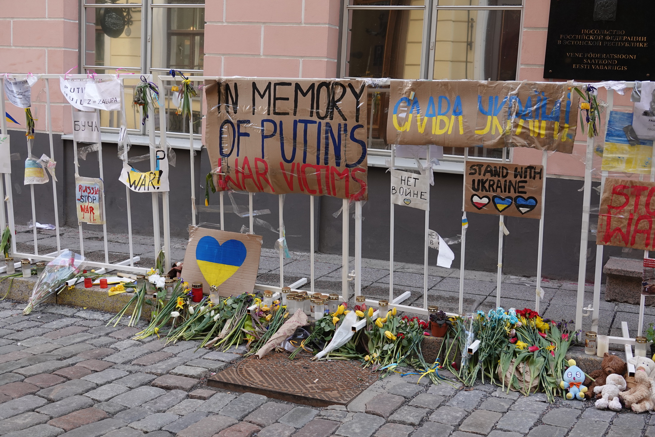 … mon voyage à Riga et à Tallinn s’est vraiment bien passé. Mais la guerre est bien là, y compris face à l’ambassade de Russie de Riga, avec cette image géante d’un Poutine semeur de mort… D’autre part, tous les transports en commun des pays baltes arborent plusieurs drapeaux ukrainiens sur chacun de leurs tramways, trolleybus et bus ! Et partout dans les villes, des panneaux géants qui proclament la solidarité des peuples baltes avec l’Ukraine.
