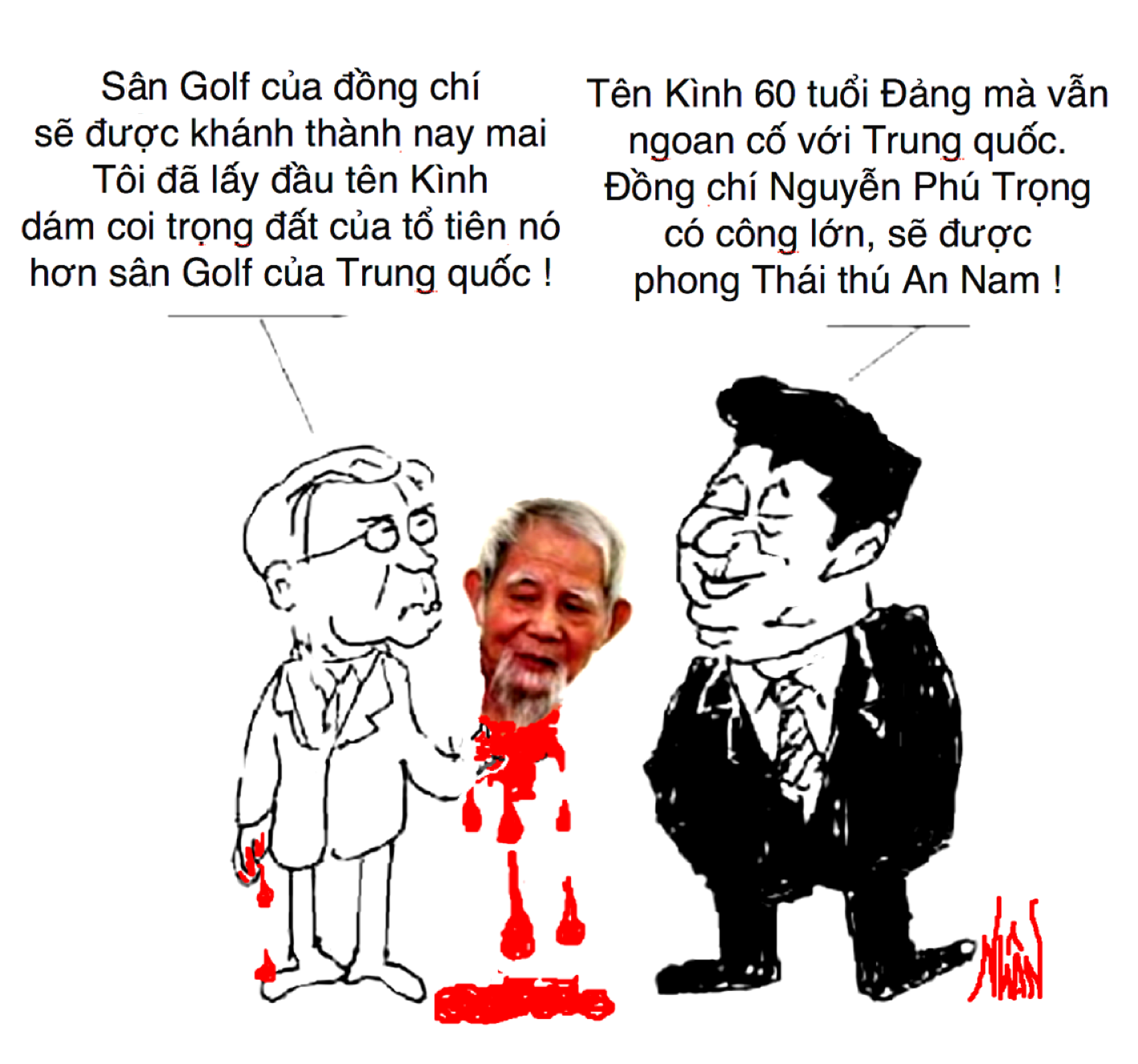 Giống như một status tôi đã từng viết cách đây mấy hôm, tôi vẫn khẳng định mấy chuyện như thế này: “Không xét ai đúng sai trong vụ đất đai tại Đồng Tâm, cũng không cần biết dân Đồng Tâm đã từng giăng biểu ngữ « Tuyệt đối tin vào chính sách của đảng và nhà nước ». Cũng không cần biết đến người nhà ô Kình từng tuyên bố « Không hợp tác với phản động ». Điều duy nhất cần nói đến ở đây là hành vi đốn mạt đàn áp dân và cướp đoạt mạng sống của họ chỉ vì Đất của cái thứ gọi là « Chính quyền ». Chúng mày (Tức đảng CSVN) gọi là « Đất quốc phòng » nhưng chúng nó lại lấy đất quốc phòng làm sân golf thì nó là thể loại quốc phòng gì? Mà nói đến đất quốc phòng thì tao chỉ chỗ cho chúng mày lấy này: Hoàng Sa, Trường Sa, Ải Nam Quan, Thác Bản Giốc, Cửa khẩu Thanh Thủy… Đất quốc phòng cả đó, đi lấy đi ?”.