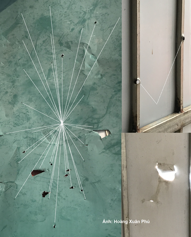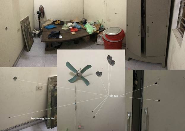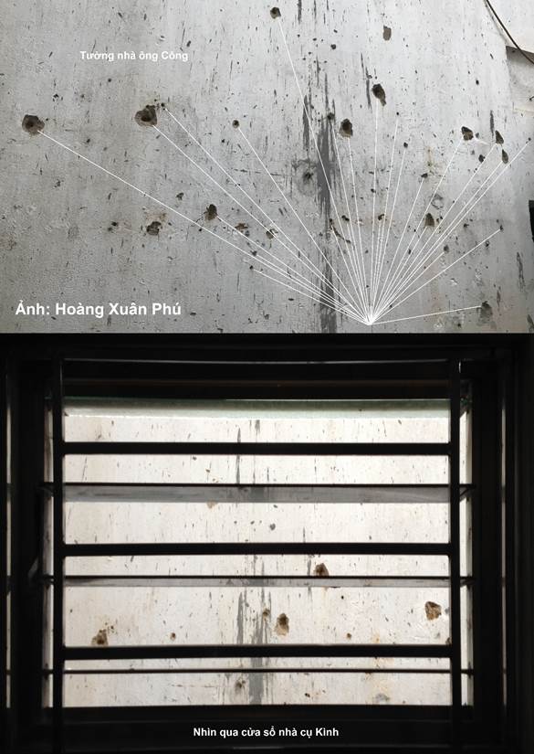| Ảnh 22: Vết đạn trên tường nhà ông Lê Đình Công (chỉ có thể bắn qua cửa sổ hoặc từ sân thượng nhà cụ Kình) |