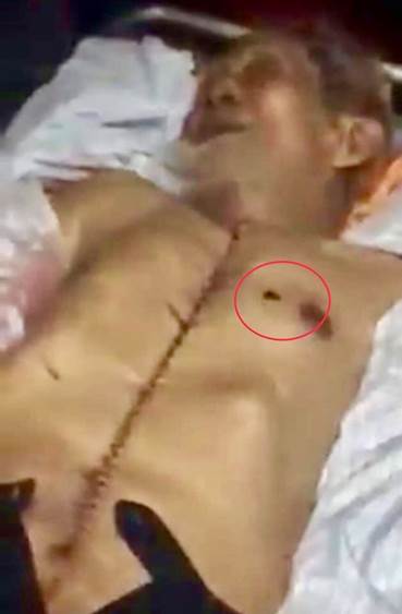 | Ảnh 8: Vết đạn bắn vào tim và vết mổ phanh trên thi thể cụ Kình |