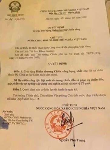 Ngày 10/1/2020, Chủ tịch nước Nguyễn Phú Trọng đã ký Quyết định số 41/QĐ-CTN, truy tặng Huân chương Chiến công hạng nhất cho ba cá nhân Nguyễn Huy Thịnh, Dương Đức Hoàng Quân và Phạm Công Huy, vì « đã lập chiến công đặc biệt xuất sắc » (xem Ảnh 15). Về phần mình, với Quyết định này, Chủ tịch nước cũng lập chiến công với ba kỷ lục.