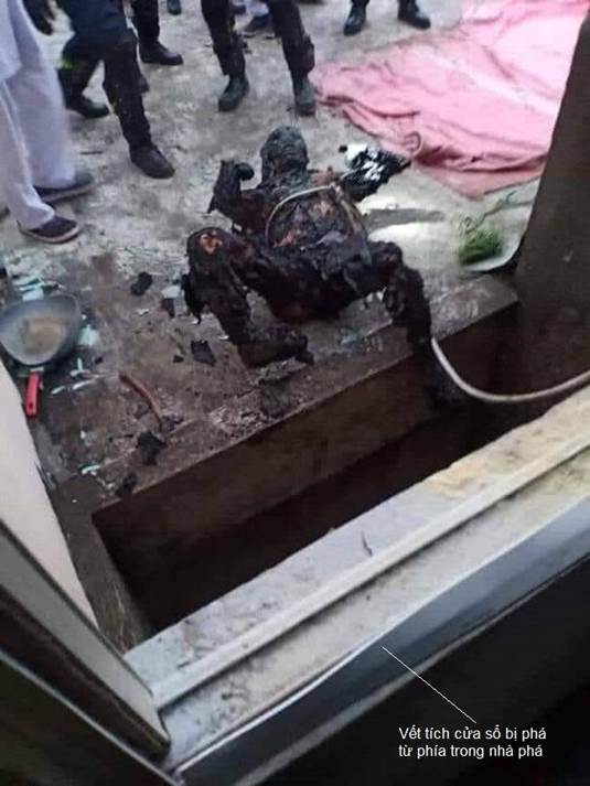 | Ảnh 17: Xác một người chết cháy và vết tích cửa sổ bị phá từ phía trong nhà phá ra |