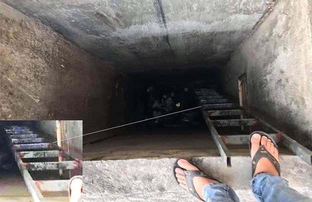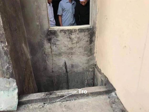 | Ảnh 24: Hố kỹ thuật với cái thang có tro đen rơi trên các bậc |